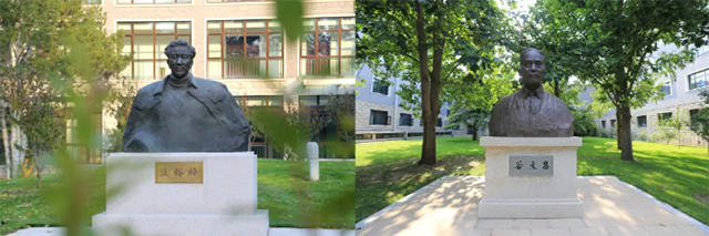 拼版照片:左圖為中央黨校(國家行政學院)校園內(nèi)的焦裕祿雕塑;右圖為中央黨校(國家行政學院)校園內(nèi)的谷文昌雕塑
