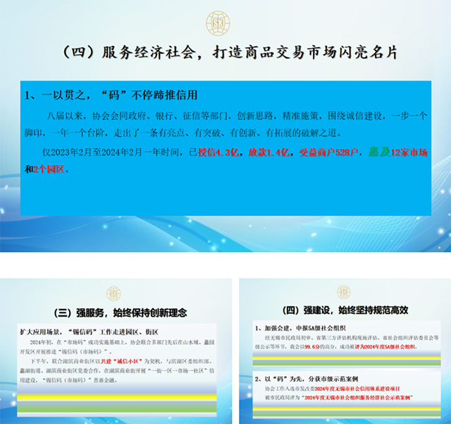 章永星執(zhí)行會長特別指出,八屆以來,協(xié)會始終圍繞服務(wù)宗旨,立足誠信建設(shè),堅持黨建引領(lǐng),創(chuàng)新服務(wù)內(nèi)涵,先后成功探索并實踐了以普惠金融核心服務(wù)的信用場景新應(yīng)用:“市場碼”“錫信碼”“園區(qū)碼”“區(qū)塊鏈”等“信用+市場+合作+”的新路徑,得到了市委社會工作部、市發(fā)改委、市商務(wù)局、市工商聯(lián)、市民政局等政府職能部門的一致認(rèn)可,也得到了省信用辦的指導(dǎo)關(guān)注。