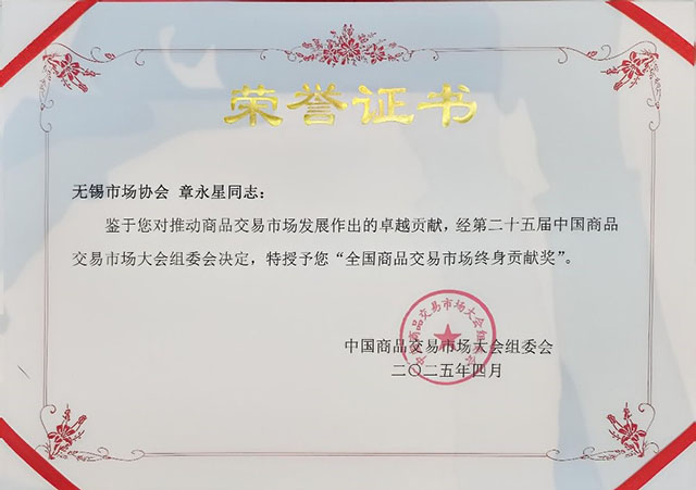 大會(huì)特別授予無(wú)錫市場(chǎng)協(xié)會(huì)榮譽(yù)會(huì)長(zhǎng)章永星“全國(guó)商品交易市場(chǎng)終身貢獻(xiàn)獎(jiǎng)”,以表彰其多年來(lái)對(duì)商品交易市場(chǎng)發(fā)展作出的突出貢獻(xiàn)。這一殊榮不僅是對(duì)章永星會(huì)長(zhǎng)個(gè)人成就的肯定,更是對(duì)無(wú)錫商貿(mào)行業(yè)發(fā)展的高度認(rèn)可。