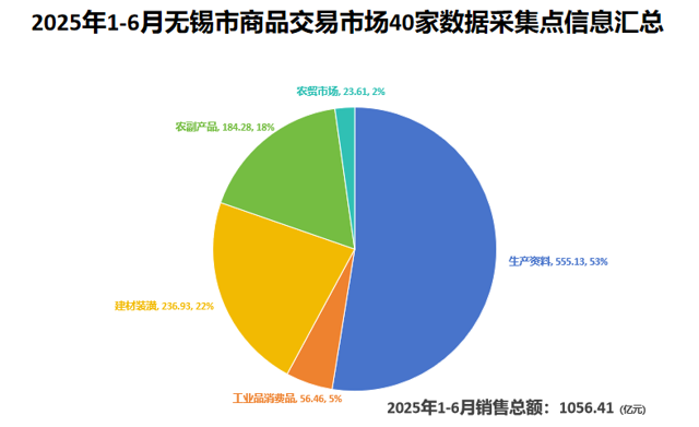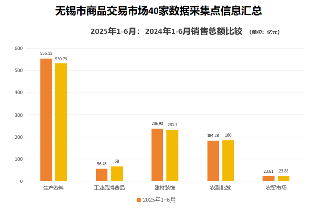 根據(jù)無錫市場協(xié)會(huì)2025年7月初的最新采集數(shù)據(jù),2025年上半年,無錫市商品交易市場五大行業(yè)(涵蓋生產(chǎn)資料、工業(yè)品小商品、建材家居、農(nóng)副產(chǎn)品批發(fā)、農(nóng)貿(mào)市場)的40家重點(diǎn)市場單位,實(shí)現(xiàn)交易總額1056.41億元,同比增長1.54%。盡管這一增速低于全市社會(huì)消費(fèi)品零售總額5.0%的整體增速,但在全球貿(mào)易形勢復(fù)雜多變、國內(nèi)消費(fèi)結(jié)構(gòu)深度調(diào)整的大背景下,無錫市商品交易市場憑借自身的適應(yīng)能力和創(chuàng)新舉措,展現(xiàn)出了較強(qiáng)的市場韌性,為后續(xù)發(fā)展積蓄了力量。